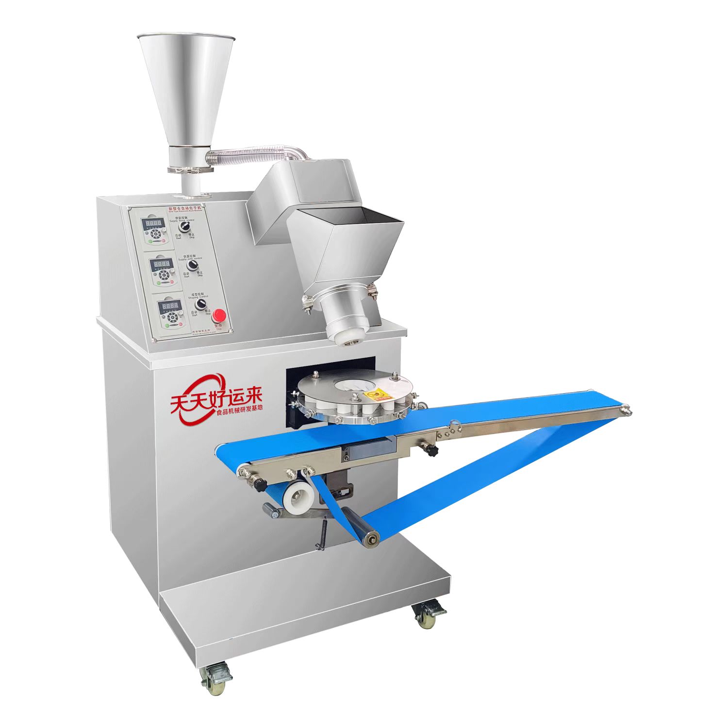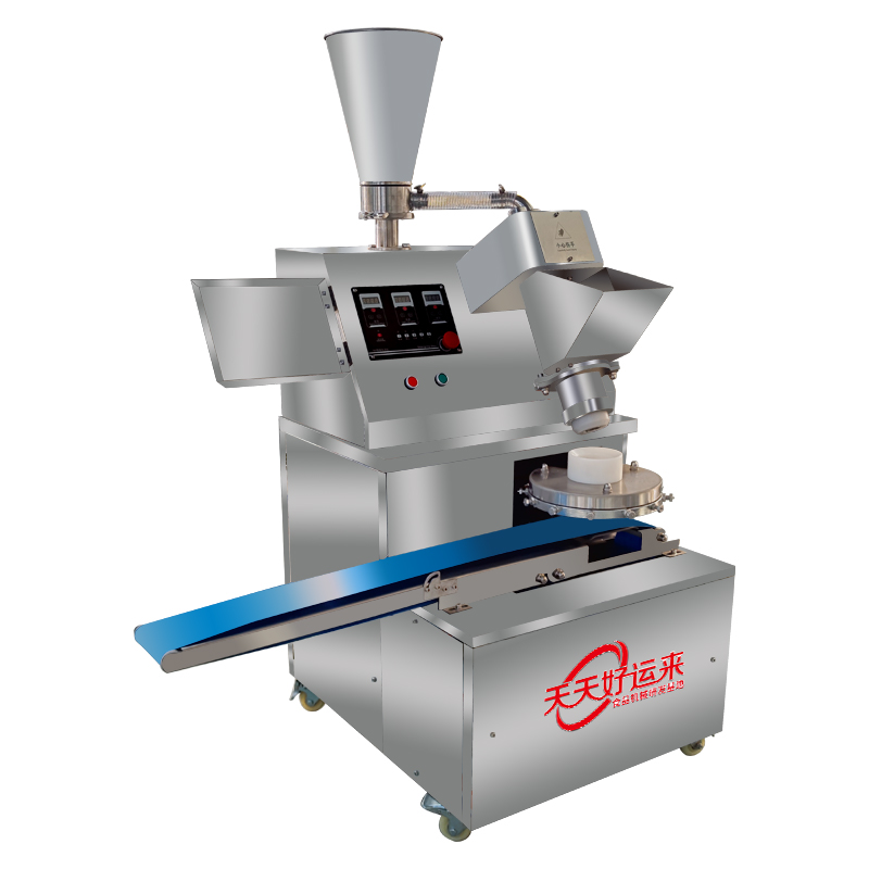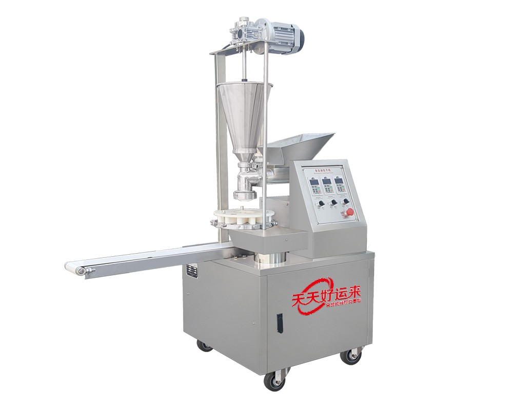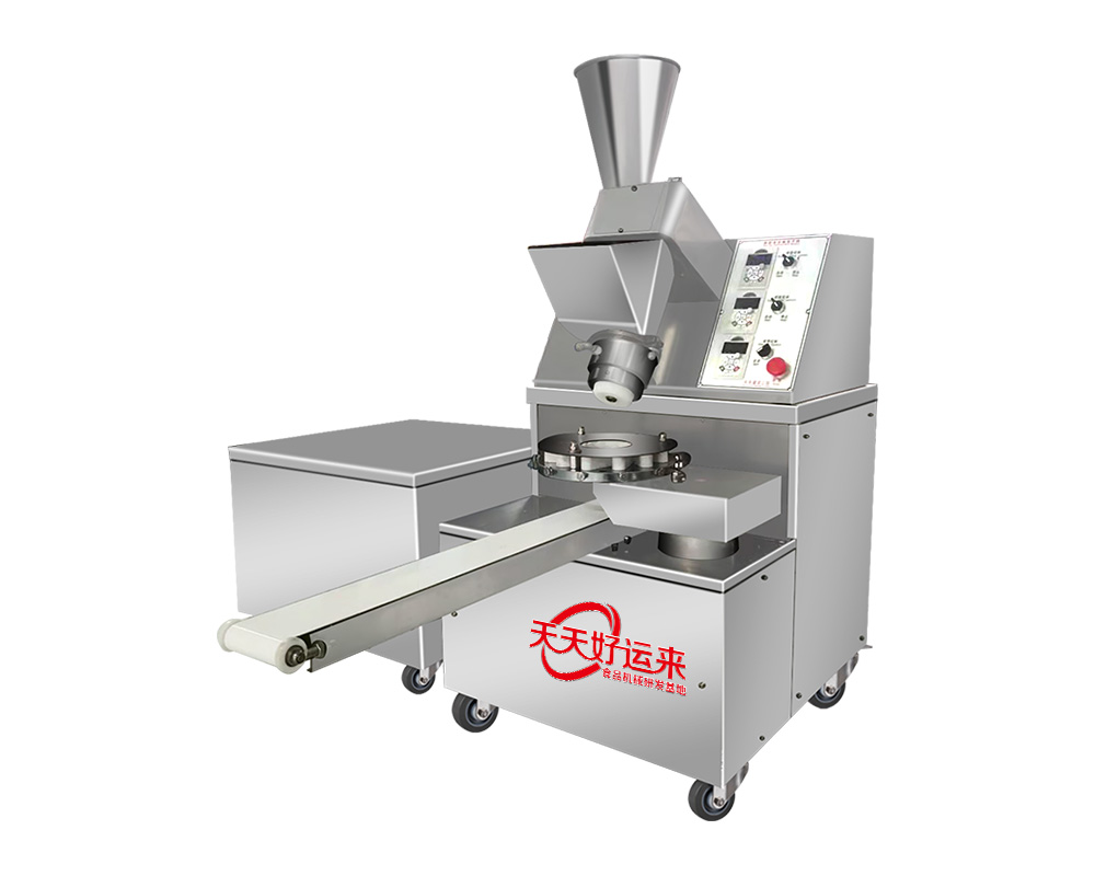 多功能包子機采用螺旋式推面方式,由模具控制面皮的厚薄。面斗中的面由供面調系統,將面送至機頭出口處,形成含餡的面柱后由成型盤內的成型塊將面柱擠斷成大小均勻的包子。全機的工作部分主要由:送面系統、送餡系統、機頭、成型盤、輸送帶五部分組成。工作流程:供餡料斗-〉供面斗)-〉加餡加面-〉切斷成型-〉傳送帶-〉醒發-〉蒸制;優勢:采用雙絞龍,螺旋揉面推進出面,大螺徑,緩慢勻速出面,面皮受力小,供面速度可調。餡管采用半臥式或立式餡斗裝置,立式有利于改大顆粒餡料的流通,在制作較稀餡料時可采用半臥式餡斗下均勻。 可加配值可生產:餡餅和方型饅頭、圓饅頭等。成型盤采用軸承傳送,配合刀塊張合防止以前包子機做大包子成型堵面現象。有9褶或12褶和16褶花型供用戶選擇,進口高分子材料刀塊利用科學原理均衡受力減小,解決了其它包子機成型刀塊靠一塊主刀推動其它副刀運動易磨損,刀夾面粘面,易受天氣變化而熱脹冷縮不能正常生產的難題,促進機器穩定延長使用壽命。免費培訓包子制作技術、及速凍生胚技術;