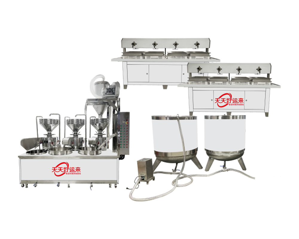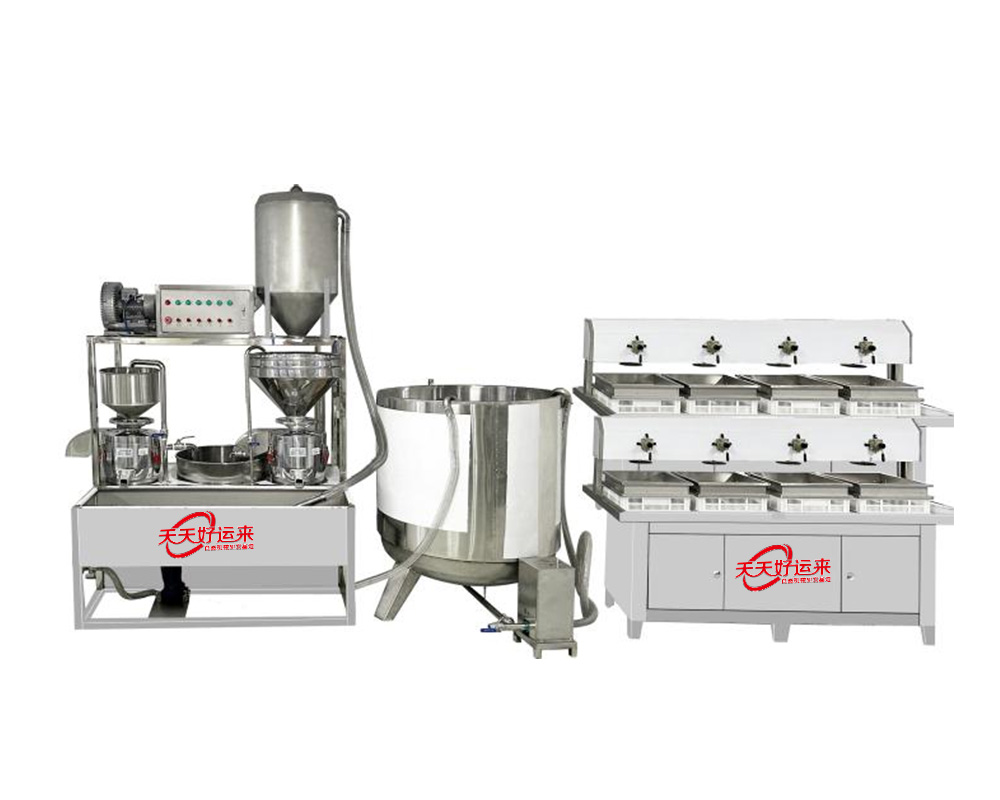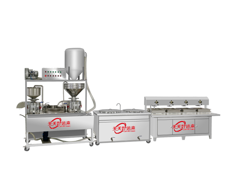 我公司生產(chǎn)豆腐機(jī)在國內(nèi)是較早的企業(yè),多年來通過對設(shè)備的不斷改進(jìn),利用現(xiàn)代科技與傳統(tǒng)工藝的完美結(jié)合。使設(shè)備外觀設(shè)計美觀、智能化高,操作簡單,主要有自動上豆系統(tǒng)、磨漿機(jī)系統(tǒng)、拌渣提升系統(tǒng)、煮漿桶(蒸氣機(jī)用戶自備)、成型機(jī)等組成。機(jī)器采用不銹鋼制造,干凈衛(wèi)生,技術(shù)領(lǐng)先,質(zhì)量可靠,經(jīng)久耐用。實現(xiàn)了批量生產(chǎn)過程自動化,具有高效、省時、耗能低等優(yōu)點。采用先進(jìn)空真上豆技術(shù)和連續(xù)磨漿技術(shù),瞬間加熱工藝,保證了蛋白質(zhì)不受破壞,從而使生產(chǎn)出來的豆制品營養(yǎng)更豐富,味道更鮮美。工藝流程: 將浸泡好的黃豆由高速分離磨漿機(jī)加工,排出豆渣,產(chǎn)出的豆?jié){經(jīng)過蒸汽加熱達(dá)到去腥,并煮漿均質(zhì),并添加輔助原料消泡、凝固劑(如鹵水、石膏、內(nèi)脂、酸漿等)、成型和深加工處理便可產(chǎn)生出營養(yǎng)豐富的豆制品如:豆?jié){、豆腐腦、豆腐、豆干、豆皮、素雞、豆泡等制品,適用于大型賓館、超市、企業(yè)食堂、工程店及食品廠批量加工使用。